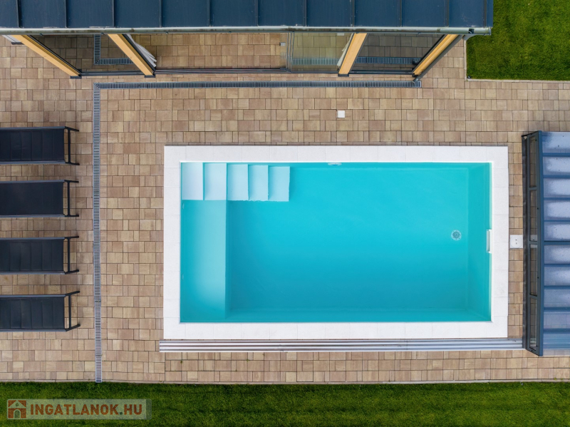- H tarifás villanyóra - 6x3 m- es vasbeton szerkezetű, hőszivattyúval fűtött medence napozórésszel. (gépházzal, automatizált gépészettel)