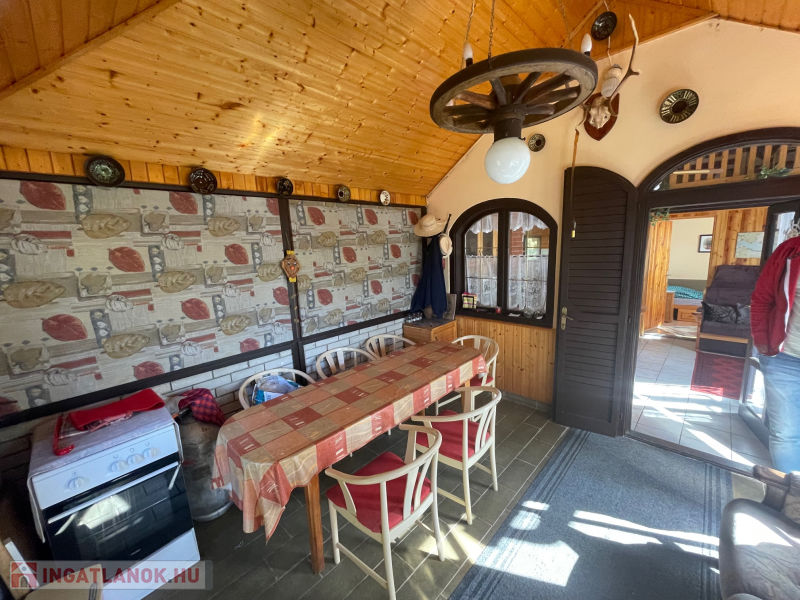 Bal oldali, könnyűszerkezetes lakrész: nappali, amely felett galériázott háló lett kialakítva, zuhanyzós fürdőszoba + WC, konyha, hálószoba, tágas előtér. Fűtése: klíma és lemezkandalló